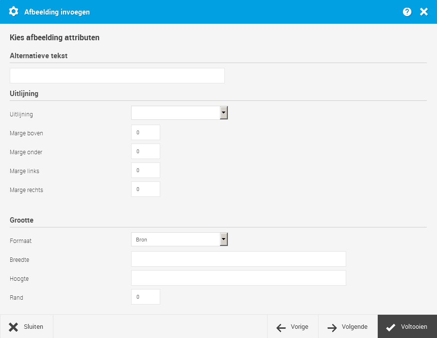 Na het kiezen van de te gebruiken afbeelding kunt u de wizard "Voltooien" om de afbeeldingen in te voegen. Het is echter raadzaam om ook de laatste stap van de wizard uit te voeren. Hier kunt u namelijk de attributen van de afbeeldingen instellen. Wilt u attributen instellen klik dan op " Volgende" i.p.v. " Voltooien". De volgende elemten kunt u per afbeelding instellen: